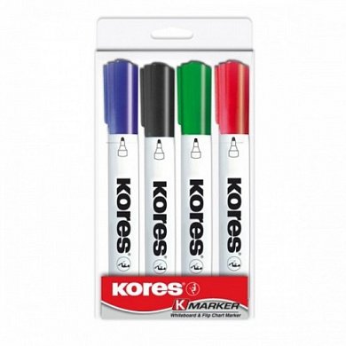 Набор маркеров для белых досок Kores. Круглый наконечник, чернила практически без запаха. В наборе синий, красный, зеленый, черный.