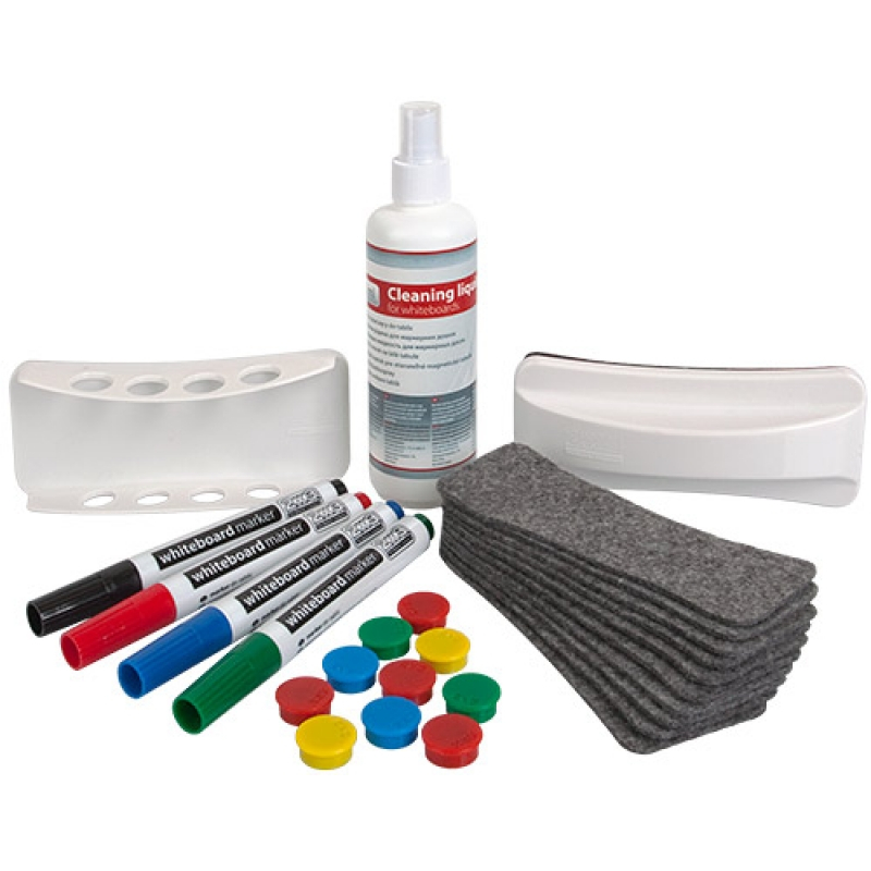 Стартовый набор для работы с белыми магнитно-маркерными досками. В комплекте: 4 маркера (красный, синий, зеленый, черный) и держатель для них, чистящая жидкость 200 мл, магнитная щетка и 10 сменных вкладышей, набор из 10 магнитов диаметром 20 мм.
