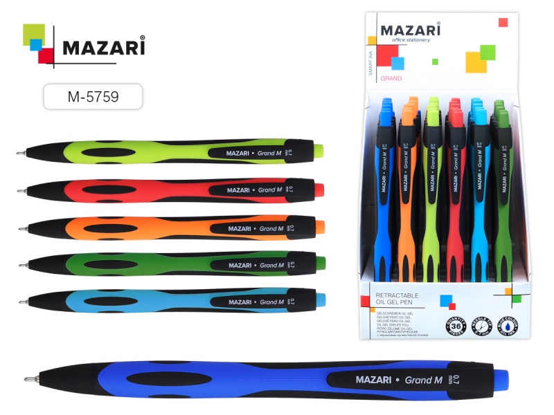 Ручка шариковая автоматическая Mazari GRADA. Чернила на масляной основе. Пишущий узел пулевидный - 0.7 мм. Цветной пластиковый корпус, с резиновым грипом. Цвет чернил -синий.