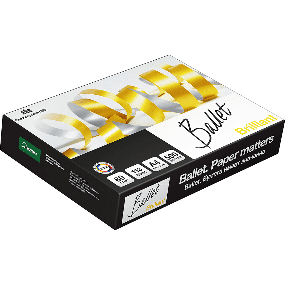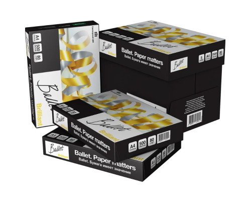 Бумага для офисной техники Ballet Brilliant - это бумага наивысшего качества, класс А+. Белизна - 165 % CIE, плотность - 80 г/м.кв. Формат А4. Предназначена для печати документов на любом оборудовании, для хранения документов в архивах более 200 лет. Пачка - 500 листов.