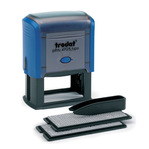 Самонаборный  пластиковый штамп Trodat 4913DB, пятистрочный.  Прямоугольной формы. В комплект входят: пластиковая оснастка с прямоугольной рифленой пластиной, встроенная сменная подушечка синего цвета, пинцет, касса символов высотой 3,1 и 2,2 мм. Максимальный размер оттиска 58 х 22 мм. Максимальное количество знаков в строке основного шрифта - 35. Шрифт для выделения текста - 23. Максимальное количество строк - 5.