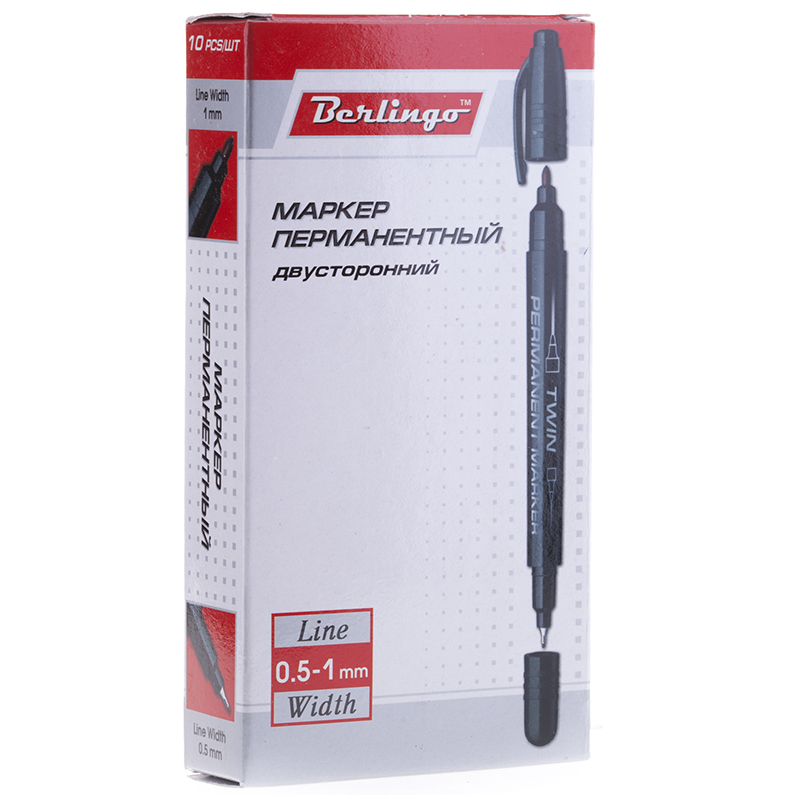 Двусторонний перманентный маркер Berlingo. Толщину линии письма варьируется от 0,5 до 1 мм. Чернила на спиртовой основе. Подходит для использования на большинстве поверхностей. Не растекается.