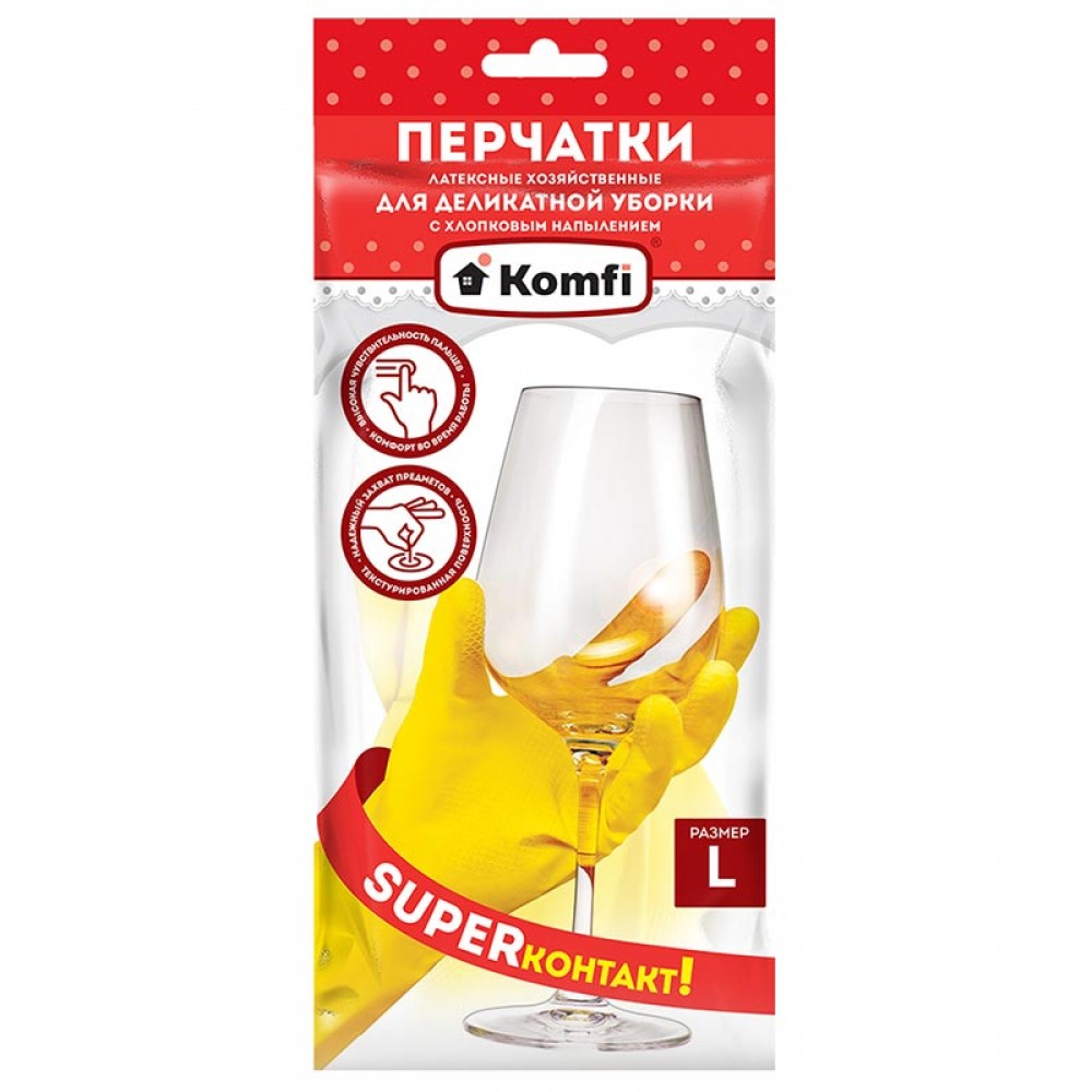Резиновые, латексные перчатки с ультратонким нанесением хлопка Komfi. Отличный вариант для работы с хрупкими предметами: стекло, хрусталь, фарфор, зеркала. Размеры в ассортименте.